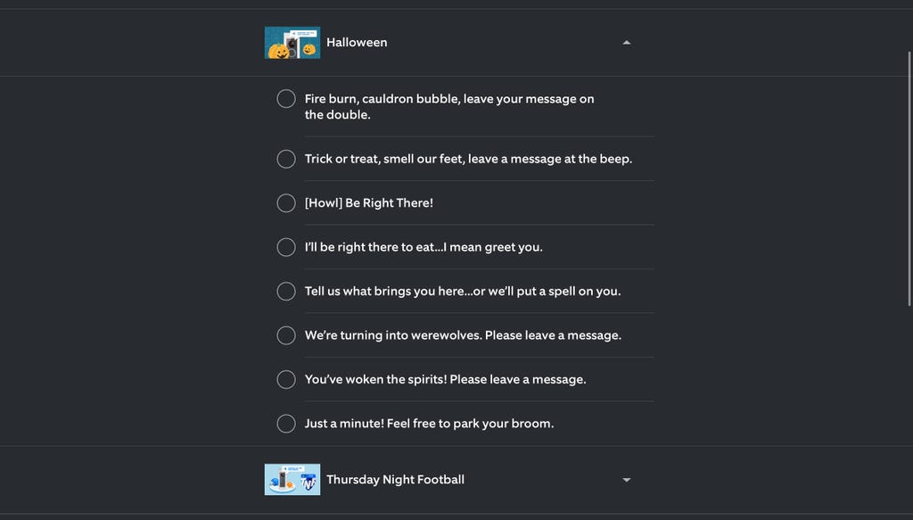 Some doorbells, including Ring's, allow you to customize your doorbell replies. It's an easy way to have fun with guests, like setting a Halloween greeting. Other Ring options include a Thursday night football message or just a general "Leave a message at the beep" response. Many doorbells offer customizations here.