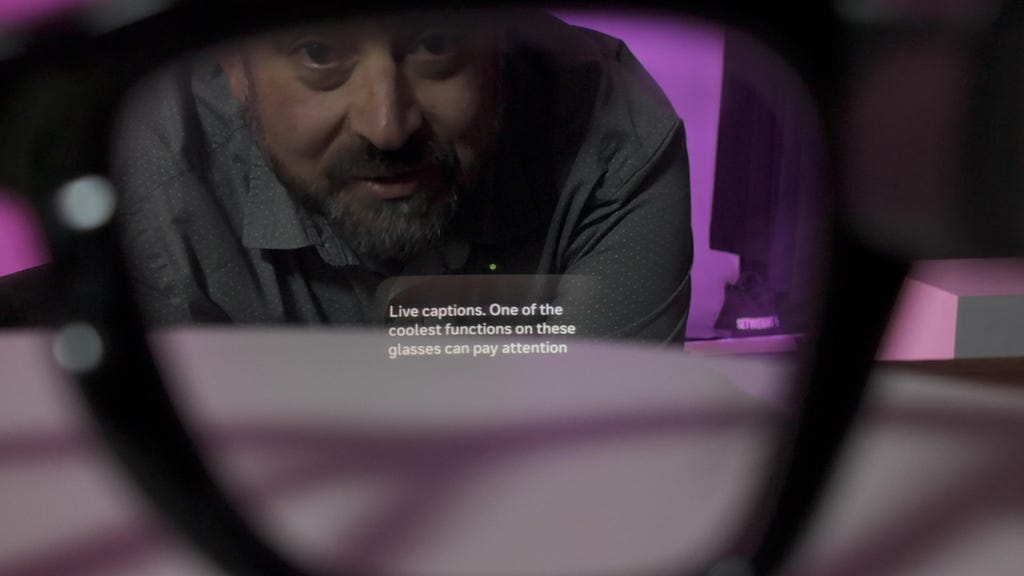 One feature unique to these glasses is assistive captioning, and it might be the most magical feature of all. It uses the microphones to focus only on the speaker in front of me and translates what they say to text that appears in the display moments later. I can see people wanting these just for the captioning alone.