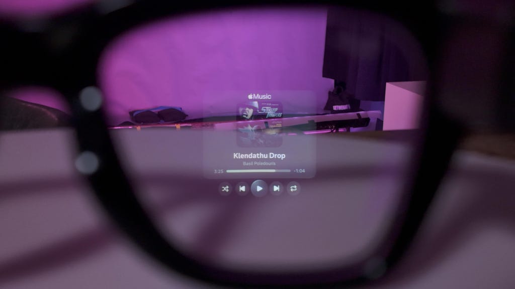 The wrist and display upgrades on these glasses make the whole experience feel equal parts futuristic and odd. I'm sort of an everyday cyborg who can summon screen readouts into my vision. Sometimes it feels like my life has become a first-person video game. Other times it feels like I've glued a smartwatch to my face or given my eye Apple CarPlay.