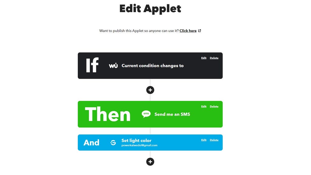I was able to ask the IFTTT AI feature to create this automation for me. I simply said, “sent me a text message and turn my floor lamp blue when it is going to rain within the next hour.” It took only a few seconds, but when it was completed I was able to view each step and verify it was correct. Below is a screenshot of what it looks like.