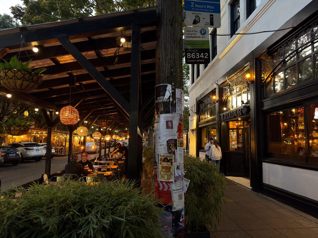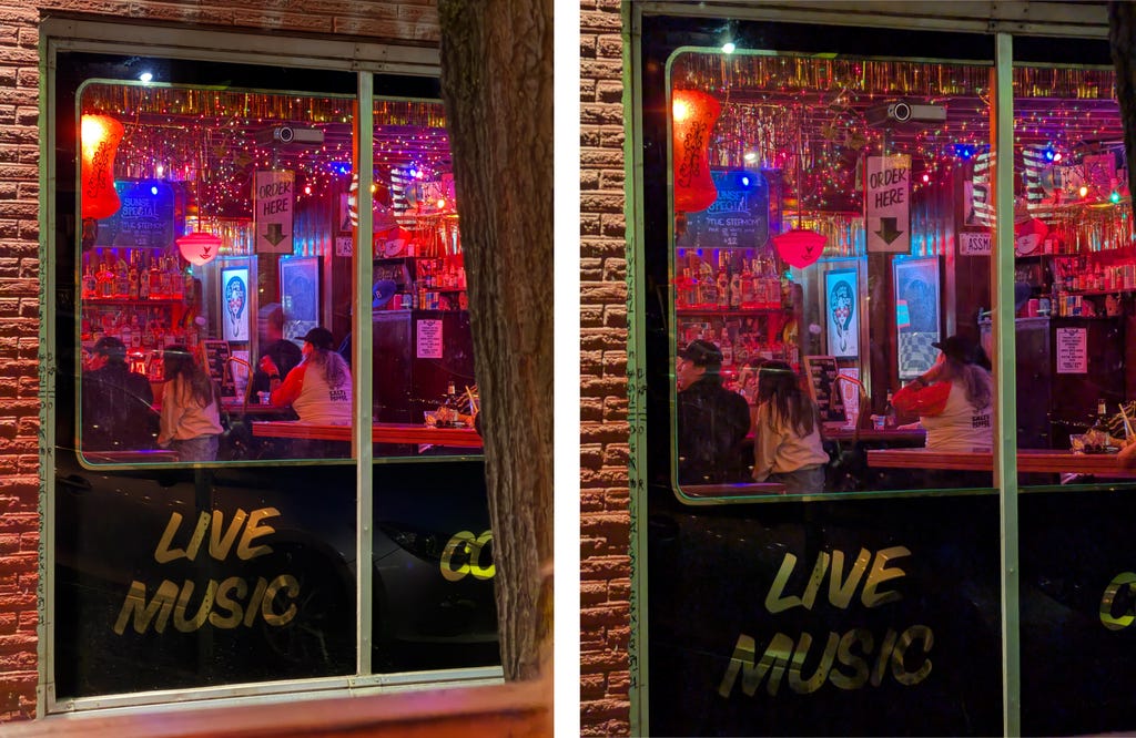 Let's pile on the darkness: Nighttime outside, taking a picture through the window of a dark bar with a full spectrum of lighting. The colors are great in both, and the Pixel 10 Pro XL image is high-resolution enough to read the poster inside and even some recognizable bottle labels. The iPhone 17 Pro's image is 12 megapixels, but it also looks good. There are a few areas of motion blur in both pointing to longer shutter speeds, but that's not a surprise in a dimly lit environment like this.