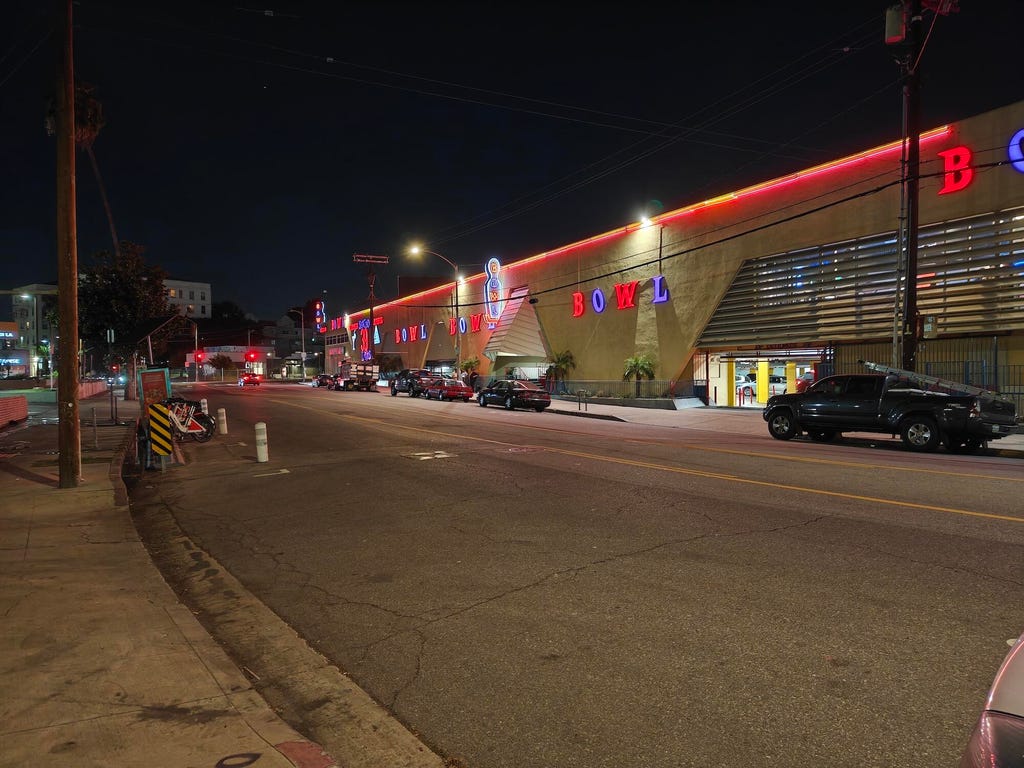 Here's the obligatory night shot of a Los Angeles street. While the city will never be dark enough to test the phone's ability to capture constellations of stars in the night sky, this does show the contrast between warm streetlights and the bright neon. The details of the stucco pockmarked the walls of the bowling alley are clear, even from across the street. Look closely at the texture of the street's pavement. It's a granular mix of grays flecked with white spots. All the grime of the city, preserved by the OnePlus 15's new shiny cameras.