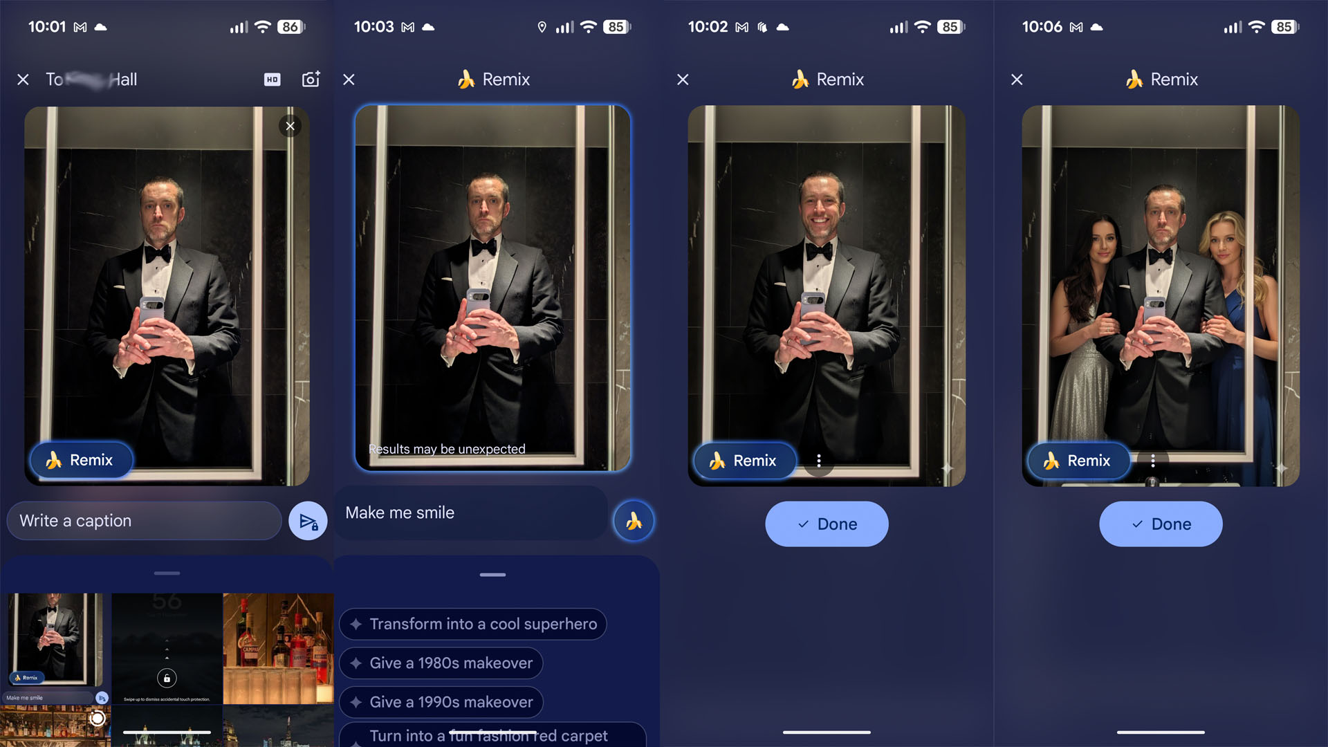 That means you'll be able to change the look of an image, with suggestions such as "turn it into a 90s sitcom" or "put on formal wear" among the suggestions. You can make yourself smile or add something else to the photo - although the recipient might not appreciate the results. Fortunately, there's a tiny watermark in the corner so that everyone knows it's AI.