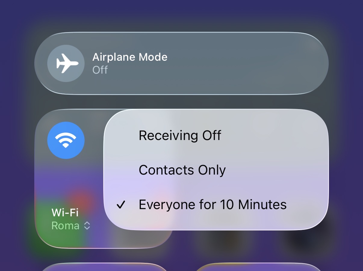 Setting AirDrop to “everyone for 10 minutes” mode on an iPhone.