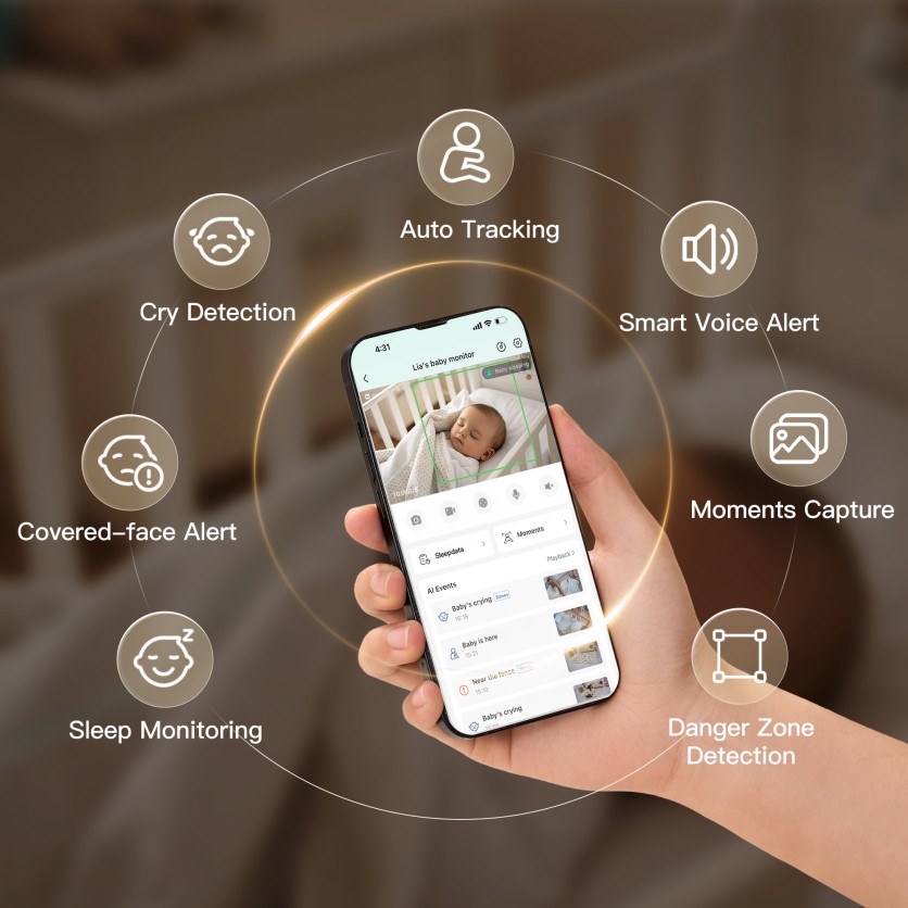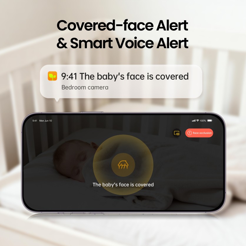 The monitor watches for two major safety issues with newborns: covered faces and crying. The Covered-Face Alert and Cry Detection features send instant phone notifications when either occurs. The Smart Voice Alert can even issue automatic warnings, adding protection when you're not actively watching the screen.
