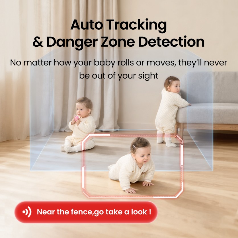 Babies grow fast. The safety worries grow with them. Once your little one starts moving around, the Monai Baby Monitor adapts. With the Auto Tracking feature, the monitor follows your baby's movement automatically, while Danger Zone Detection lets you set up a virtual safety fence around their play space.