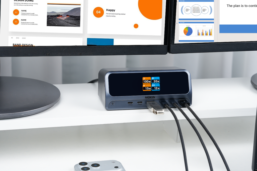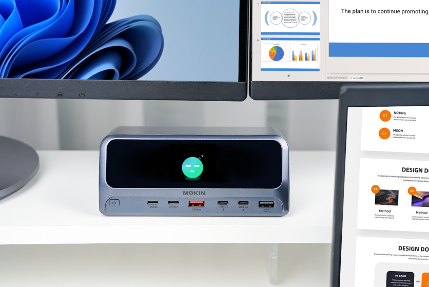 For example, the MOKiN 13-in-1 USB-C Laptop Charging Station combines 160W total power output with complete docking functionality in a vertical design. Its built-in 2.01-inch LCD intelligent display shows real-time charging status and port connections, making power management completely transparent.
