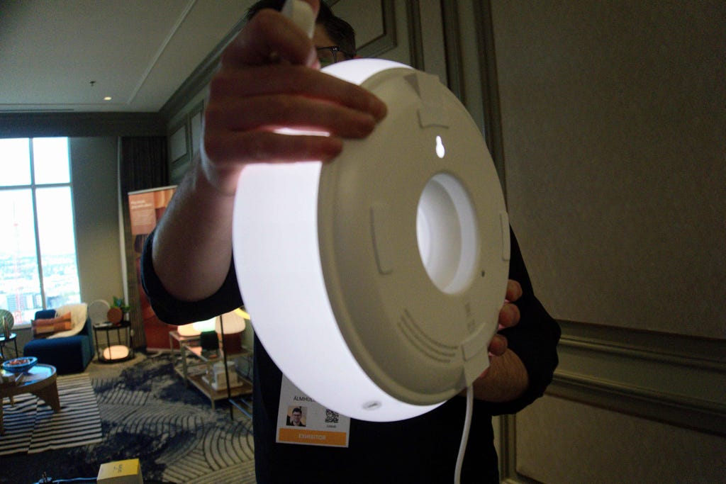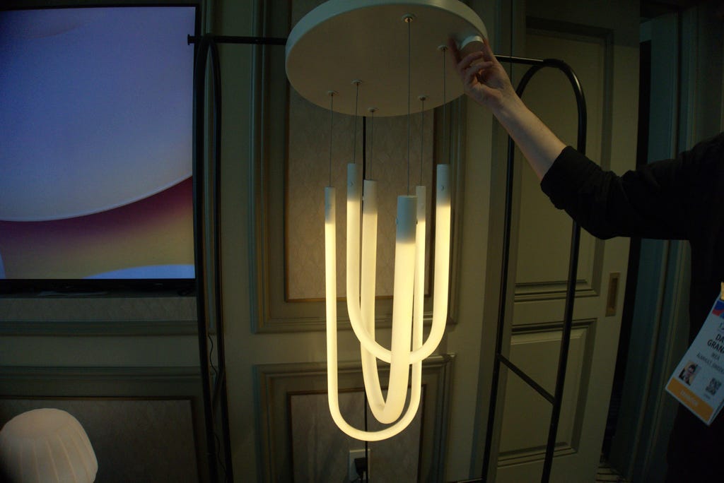 The lights come in two varieties. One is a doughnut-like ring that you can hang from a wall or place on a nearby table, casting a warm light throughout the room in any color you choose. The other is a draping LED pendant lamp, more at home hanging in a corner, with shades available across the entire white spectrum.