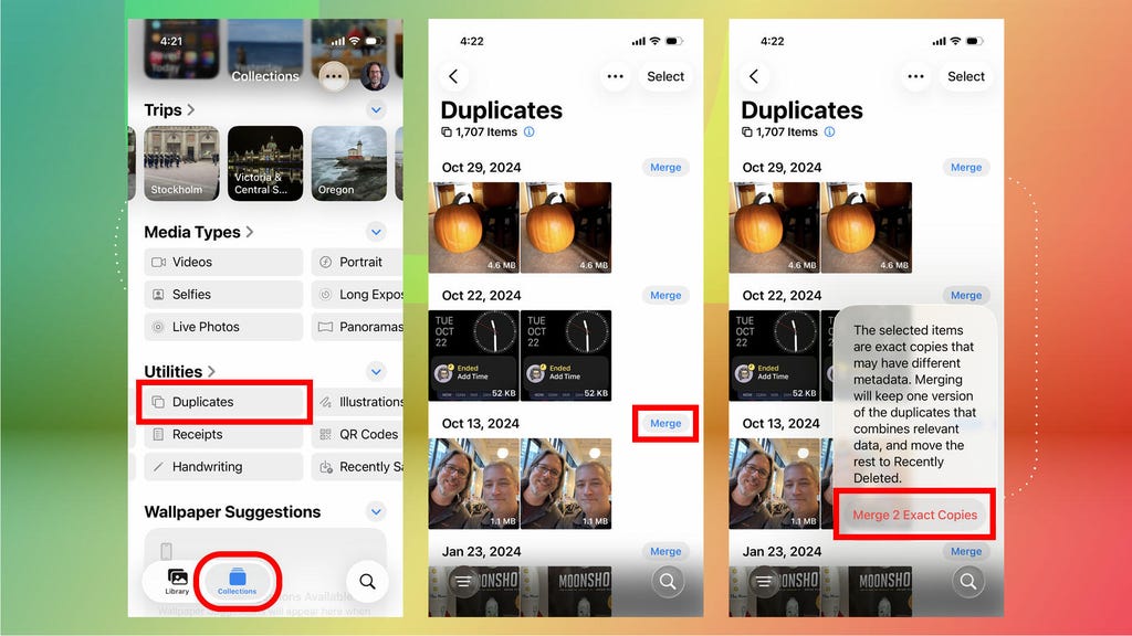 If you want to delete duplicates individually, tap the Merge button that appears next to each pair. Then tap Merge [number] Copies to delete duplicates. Go down the line and repeat this step for all the identical photos you want to delete.