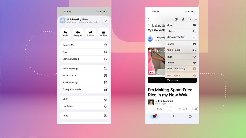 The Print option is in slightly different places for Apple Mail (left) and Gmail on iOS. Nicole Lee/CNET
