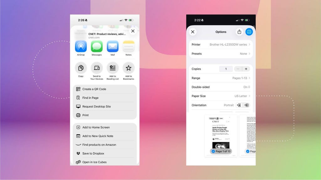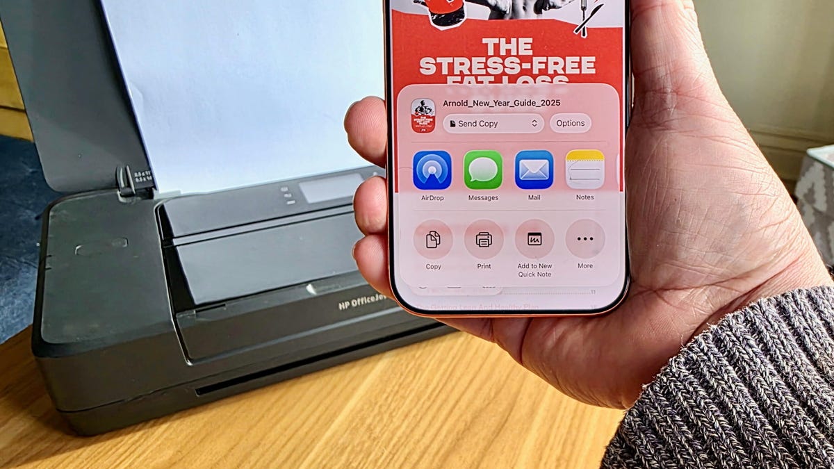 In a web browser or in the Files app, you can launch the Share menu in order to access the Print option. Selecting it will let you choose an AirPrint-enabled printer that's set up on your network. Nicole Lee/CNET
