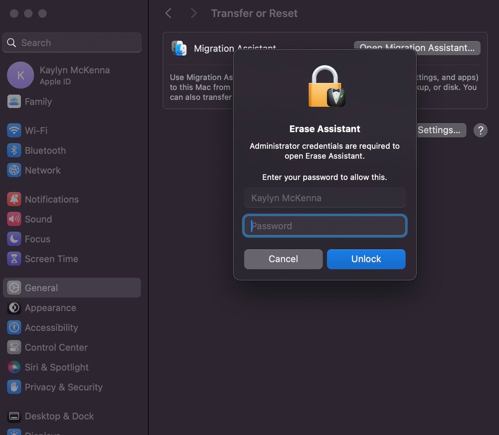 If you're running MacOS Ventura or later, click on the Apple icon in the corner of your screen, then select System Settings. Choose General > Transfer or Reset > Erase All Content and Settings. The erase assistant will then open up.