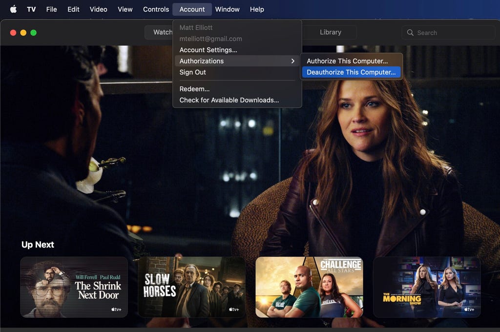 After migrating your data to your new Mac or making one last backup to preserve your data, it's time to remove all traces of yourself from the machine. First, you'll need to sign out of all of your accounts. Years ago, this was done using iTunes but you now must individually sign out of three apps -- Music, TV and Books. Open up any of those apps and go to Account > Authorizations > Deauthorize This Computer. You'll need to enter your Apple ID and password and then hit the Deauthorize button.