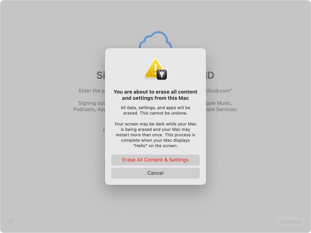 A window will pop up confirming that your data and settings will be permanently erased if you proceed. If you're ready to proceed, select Erase All Content & Settings to confirm that you want to reset your MacBook.