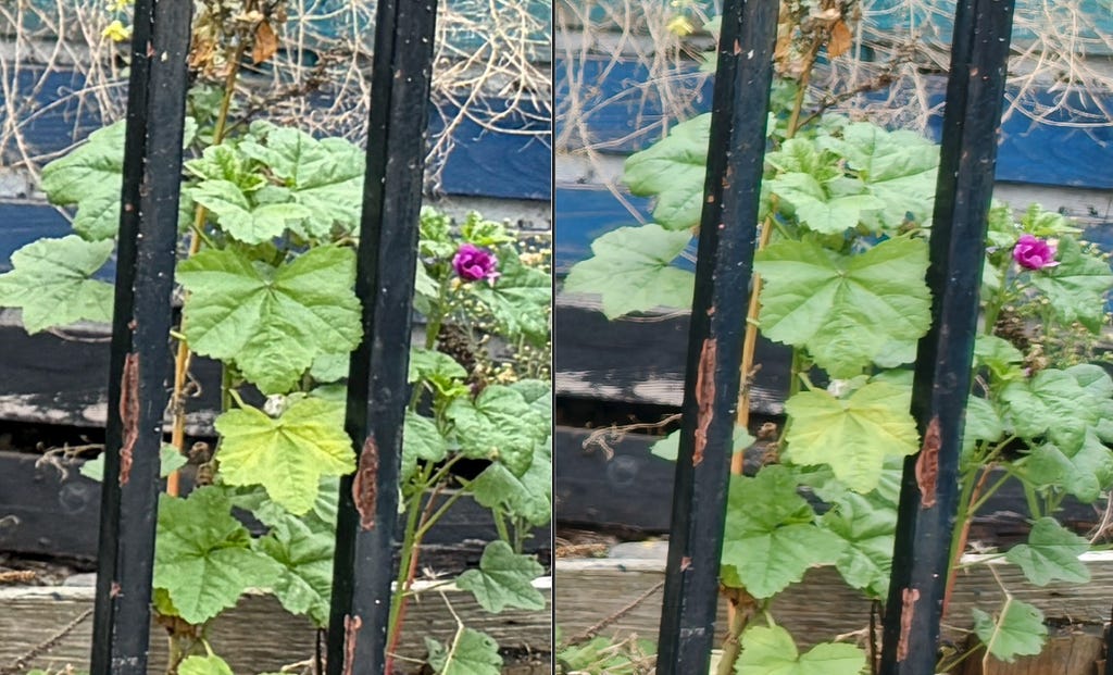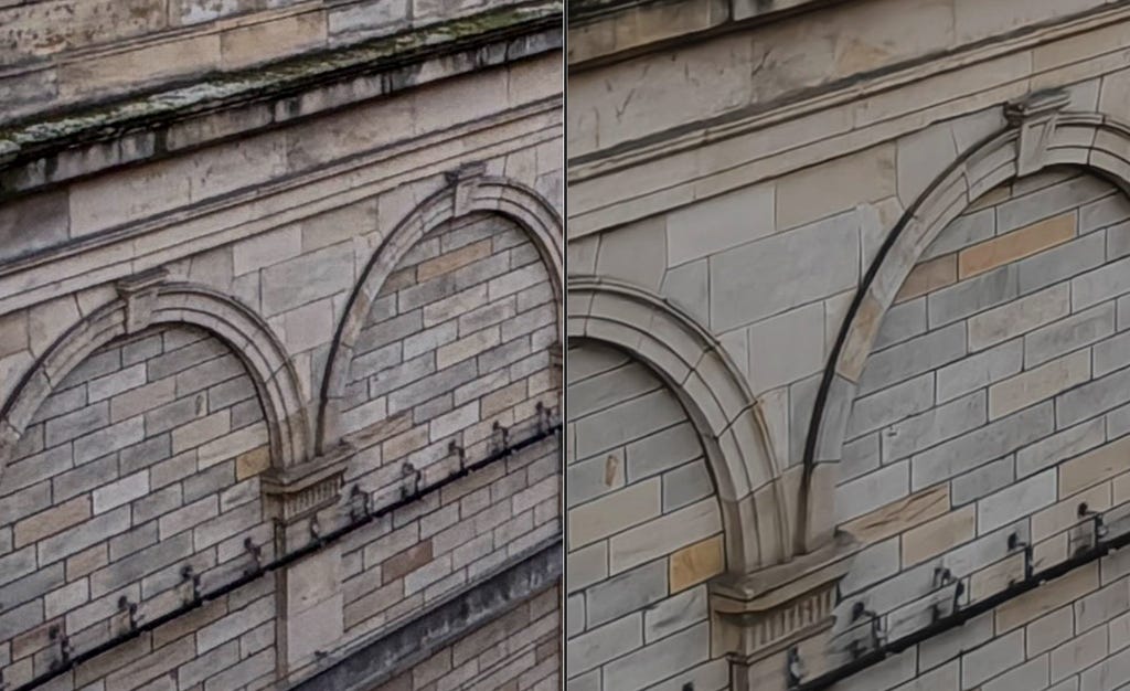 If we look up close at this section of wall, we can see that the strong lines of mortar between the bricks look sharper in the Oppo's photo on the right. But the bricks themselves look almost polished as they've been stripped of detail by the noise reduction. The iPhone's image has retained that detail.