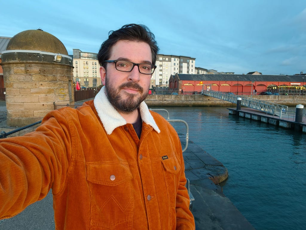 I ended on a selfie and here both phones went in interesting directions. The Oppo is certainly the winner to my eye -- it's shot is considerably sharper (without overdoing it) with more natural skin tones and an accurate orange hue on my jacket. The background is a bit overly cyan but it's certainly a better-looking attempt than the iPhone's.