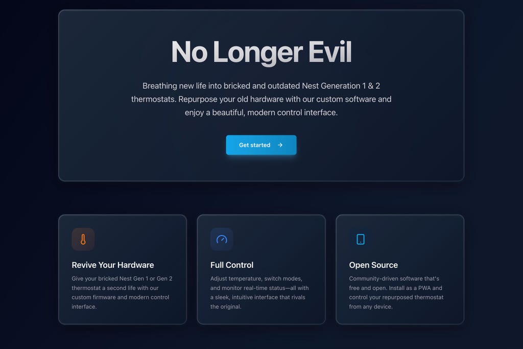 No Longer Evil creates free, open-source software that sneaks in and replaces Nest firmware with a somewhat bootlegged version made to restore remote control and other monitoring features without needing Nest, Google or the Google Home app.