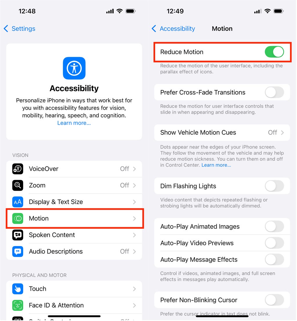 If you want subtler animations across iOS, you can enable the Reduce Motion setting. To do this, go to Settings > Accessibility > Motion and toggle on Reduce Motion.