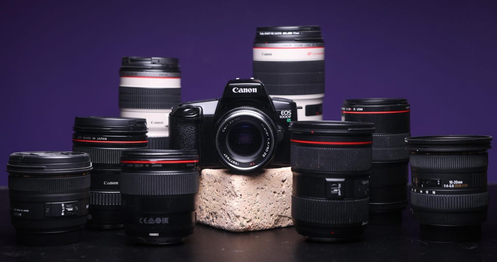 The lenses are also easier to get hold of. For example, Canon's more recent EOS line of SLR cameras uses the same lens mount as its DSLRs before they moved to mirrorless. If you're like me, you've shot with Canon's digital cameras (such as the 6D or 5D MkIV), so you may already have a cupboard full of Canon EF-mount lenses that are compatible. If not, the huge selection available means they're cheap and plentiful on the used market.