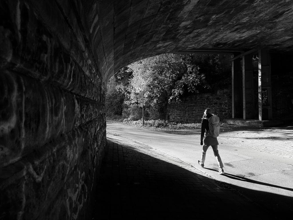 By lowering the exposure, I was able to capture a more dramatic image of this person walking through the bright sunlight, letting the rest of the bridge fall to shadow. Andrew Lanxon/CNET