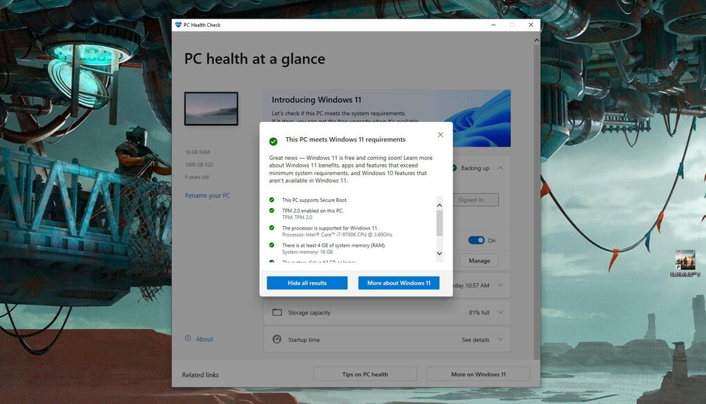 An example of what the PC Health Check app will show if your computer is Windows 11 compatible, along with the reasons why (or why not). CNET