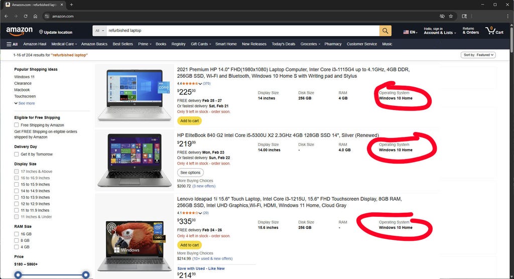 I recently needed to replace the laptop in my testing lab (aka the living room). It didn't need to be anything special, so I started looking at used and refurbished laptops on Amazon and eBay. Some of the best deals were on computers still running Windows 10 -- an operating system Microsoft recently stopped supporting, requiring you to upgrade to Windows 11 (admittedly, for free), if your PC could support it.
