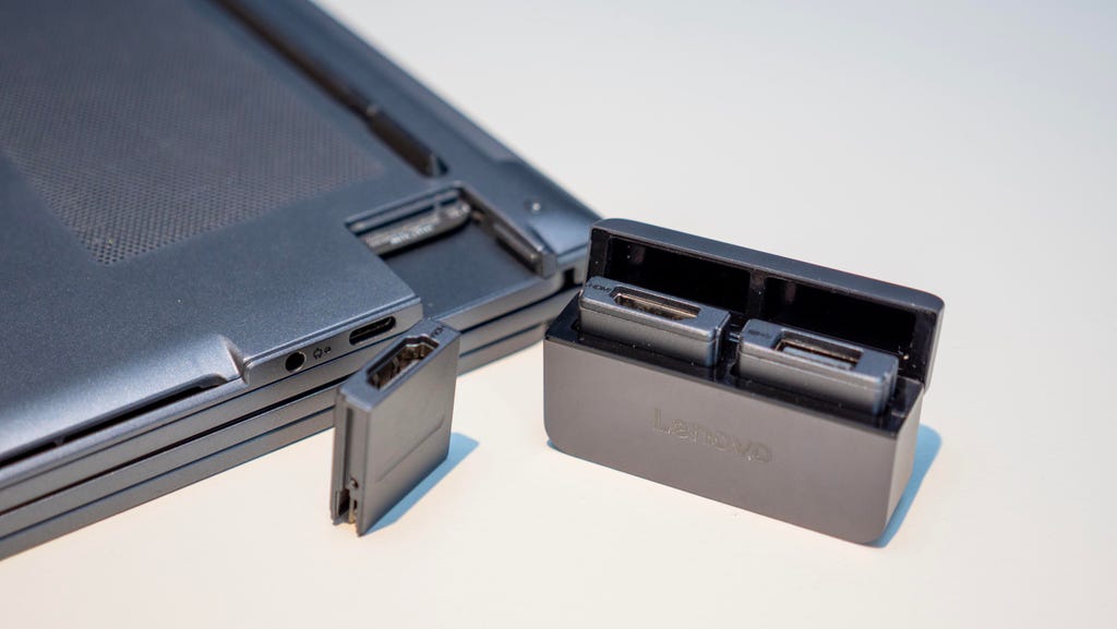 The ThinkBook Modular AI PC has modular ports you can swap in and out. Josh Goldman/CNET