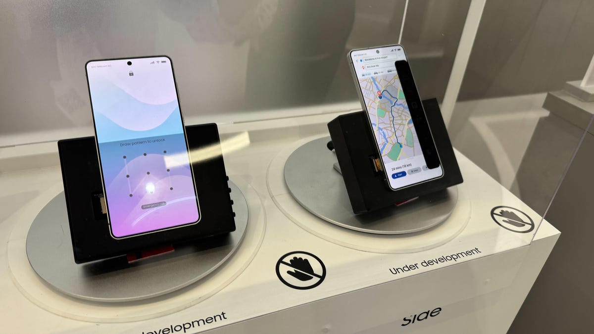Behind clear plexiglass were two phones with the note "under development" written below them. The first phone showed the Privacy Display working on the entire bottom half of the screen, while the second showed it working on a panel that ran down one side of the screen.