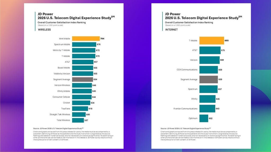 For internet service providers, T-Mobile ranked the highest in the survey with a score of 695, followed by AT&T at 675 and Verizon at 669.