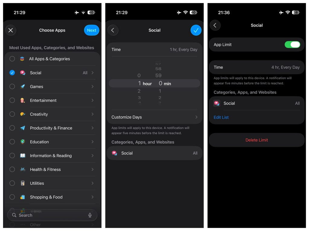 4. Tap Next and set the amount of time you want to allow yourself on each app.