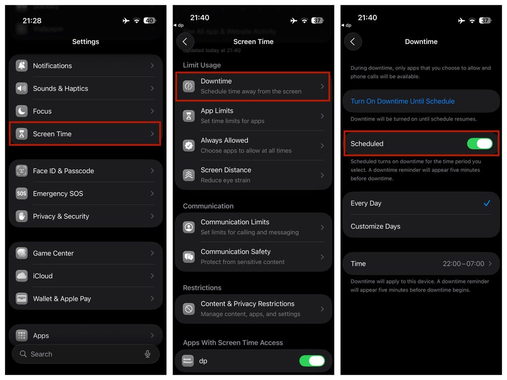 Go to Settings > Screen Time > Downtime and set a schedule. Screenshots by Prakhar Khanna/CNET