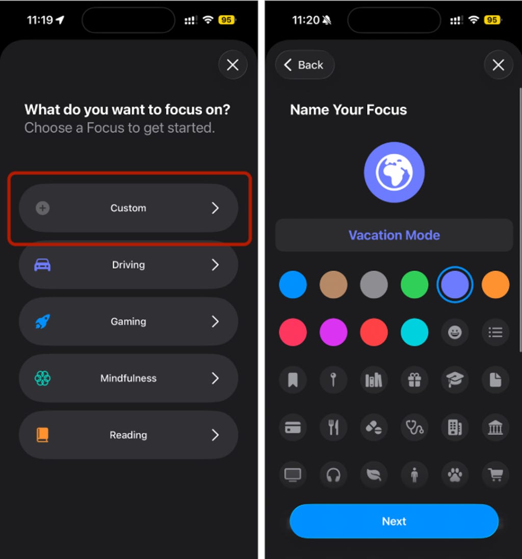 2. Tap on the + icon (on the top-right corner) to create a Custom Focus.