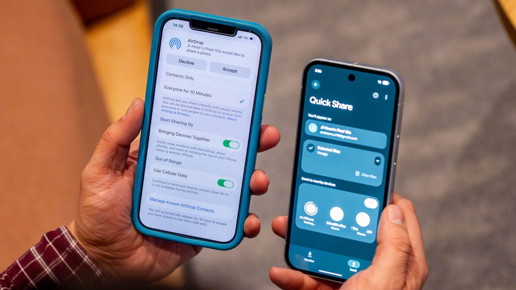 Android phones are starting to work with Apple's AirDrop, such as the Pixel 10A (right) that's sharing a photo with an iPhone 12 Pro Max. Joseph Maldonado/CNET