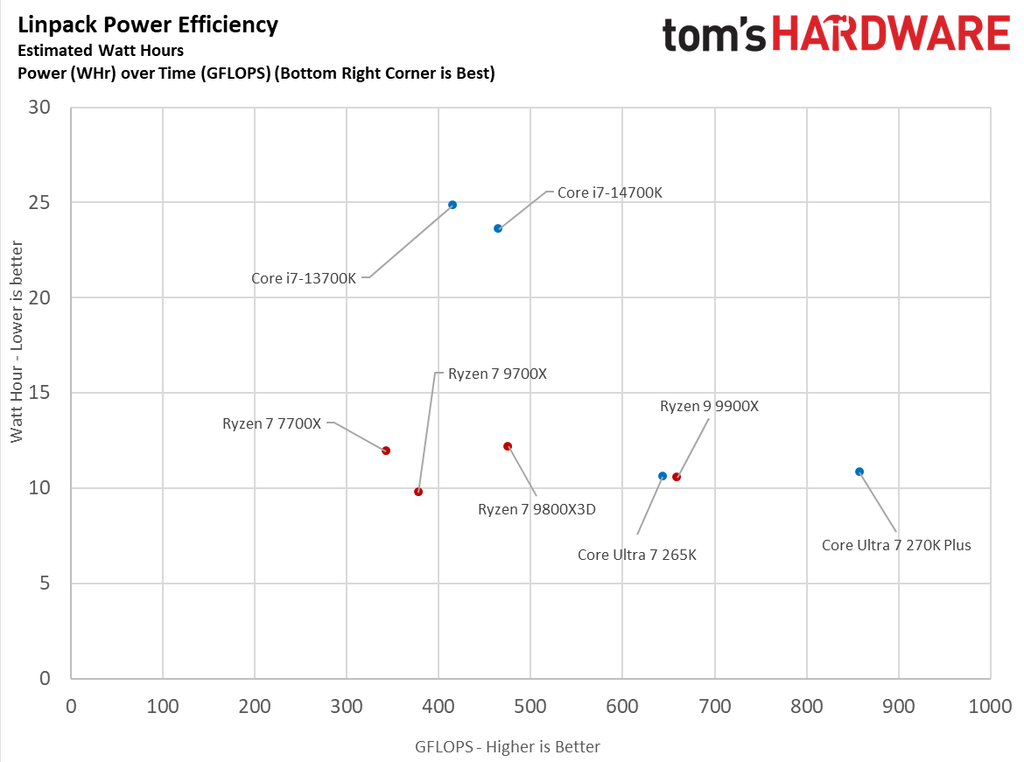 Another neat way to visualize the power consumption difference is by a scatter plot, which shows the relationship between power and performance a bit more clearly. In the Linpack efficiency graph, the Core Ultra 7 270K Plus is plotted to the far bottom right, while the 9700X is a bit to the middle. This means that the 270K Plus delivers much better performance with only a slight increase in power draw.