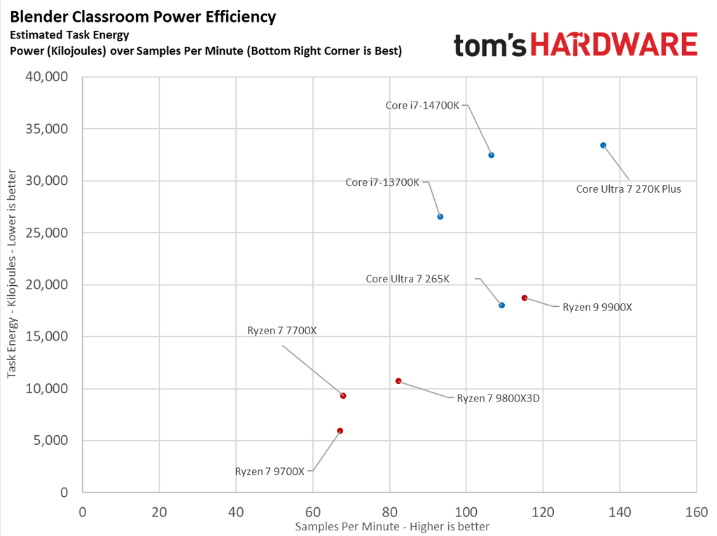 The Blender Classroom scatter plot is much more interesting. While the 270K Plus is still plotted to the far right, it is much higher on the task energy axis this time around. The 9700X is almost at the bottom-left of the graph, making it much more efficient than the 270K Plus at this task, even though its performance is quite a bit lower.