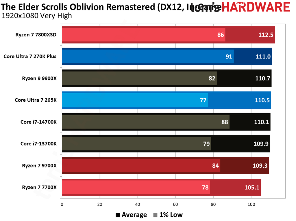 It is safe to say that the two CPUs trade blows when it comes purely to gaming performance. We also saw some results that were essentially tied, such as Monster Hunter Wilds, Final Fantasy XIV, TES Oblivion Remastered, and Baldur’s Gate 3. However, the Core Ultra 7 270K Plus slightly edges the Ryzen 7 9700X, delivering 2-3% better average gaming performance.