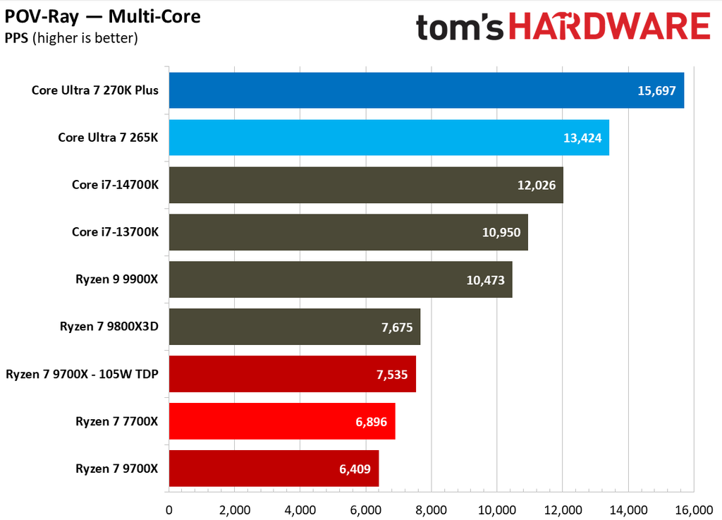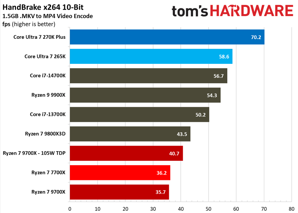 Looking at individual benchmark results, we see the Core Ultra 7 270K Plus take a gigantic 90% lead over the Ryzen 7 9700X in the Cinebench 2024 multi-core test. The POV-Ray test isn’t much better for the Red Team, as the Core Ultra 7 270K Plus has a staggering 127% higher score in this test. The lead is 74% in Blender Junkshop, 92% in V-Ray 6, and 73% in HandBrake x265 10-bit encoding test. You get the idea.