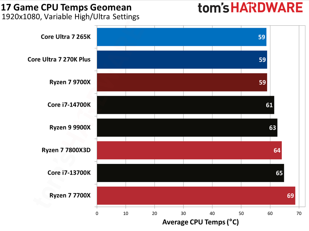 While gaming, the Core Ultra 7 270K Plus drew 107.7W, which is a big bump over the Core Ultra 7 265K. It is also 18% higher than the Ryzen 7 9700X, which drew an average of 87.8W while gaming. However, when we look at efficiency numbers calculated in FPS/W, the new Core Ultra 7 270K Plus is still 2.6% more efficient while gaming than the Ryzen 7 9700X. The temperatures of the two CPUs were not significantly different in our testing.