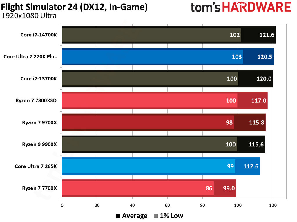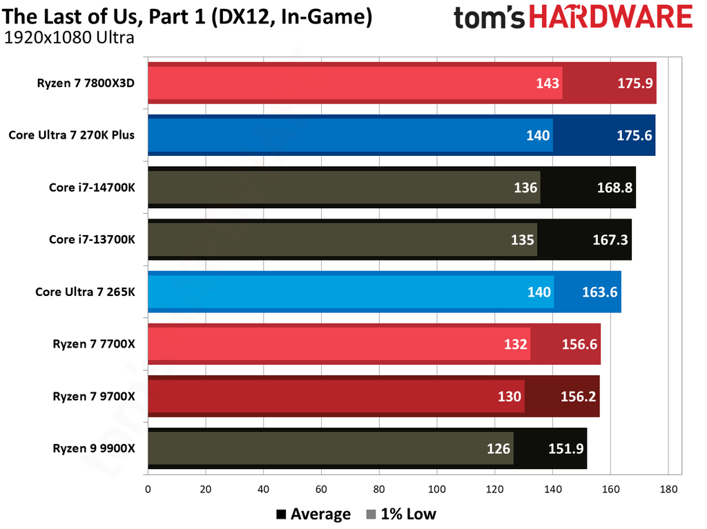 Looking at individual benchmarks tells an interesting story. In A Plague Tale: Requiem at 1080p, the Core Ultra 7 270K Plus actually trails the Ryzen 7 9700X by 3.2% on average. However, the 1% low numbers are flipped, as the Core Ultra 7 270K actually has a 14% better result in this particular title. The trend returns to normalcy in Cyberpunk 2077, where the Core Ultra 7 270K is 8% faster in both average FPS and 1% low results.