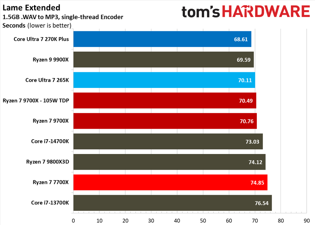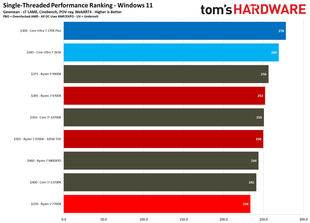 Single-threaded performance also follows the same trend, though the differences are much less dramatic this time around. Our single-threaded performance ranking geomean still has the Core Ultra 7 270K Plus at the top of the pile, with an average 10% higher score than the Ryzen 7 9700X. It also improves upon the Core Ultra 7 265K by about 3.3%, which is a welcome bump in single-threaded performance.