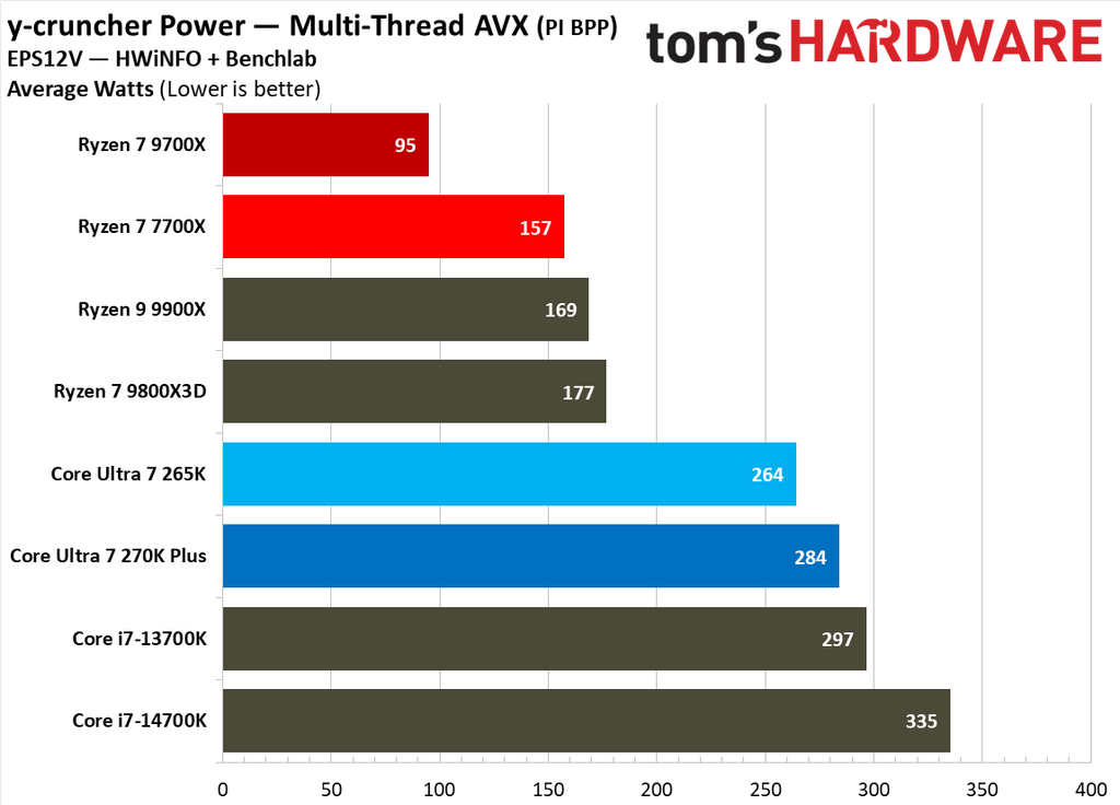 Moving on to all-core workloads to gauge peak power consumption, the Core Ultra 7 270K Plus consumes a whopping 198% more power than the Ryzen 7 9700X in the y-cruncher multi-threaded AVX test. That largely comes down to Zen 5’s implementation of AVX-512, which allows the Ryzen 7 9700X to run these SMID-style instructions far more efficiently.