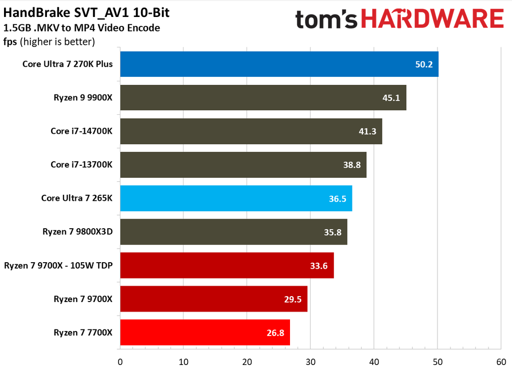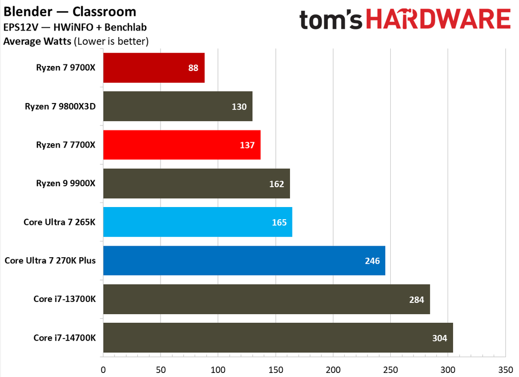 Looking at a few more benchmarks, the same trend can be seen in Blender - Monster, where the Core Ultra 7 270K Plus consumes 151% more power than the 9700X. Interestingly, the new Arrow Lake Refresh CPU also demands 45% more power on average than the Core Ultra 7 265K, a significant difference. Between the 270K Plus and the Ryzen 7 9700X, the power demand gap is around 145% in HandBrake x265 encoding, 161% in HandBrake SVT_AV1, and 179% in Blender Classroom.