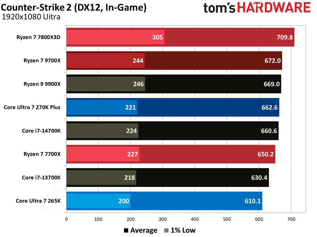 Nevertheless, the Core Ultra 7 270K Plus has its place. It is a very competent $300 CPU that decimates most of our lineup in productivity, though it is still a bit behind the Ryzen X3D CPUs in gaming. As for the Ryzen 7 9700X, it seems overdue for a price cut, as it doesn't justify its $310 price tag when more compelling options are available at a similar price.