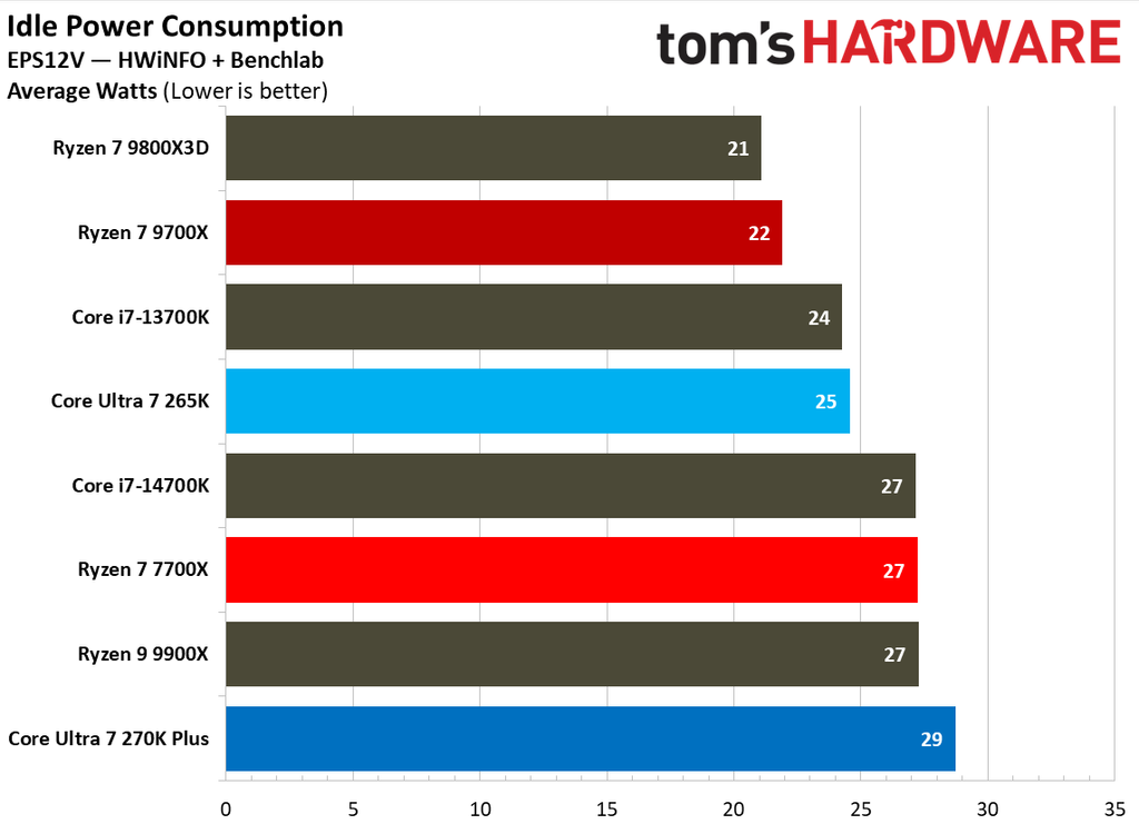 Starting with idle power consumption, the Core Ultra 7 270K Plus consumes an average of 29 watts in this test, while the Ryzen 7 9700X is around 31% lower at 22 watts. The Core Ultra 7 270K Plus also consumes 4 more watts at idle than the Ultra 7 265K. When in an active idle state, such as YouTube playback, the Core Ultra 7 270K Plus spikes to 38 watts, a clear and noticeable 52% increase over the Ryzen 7 9700X.