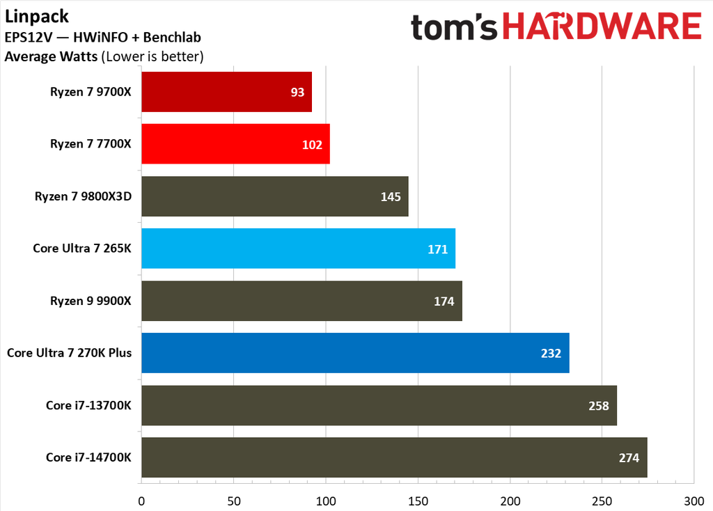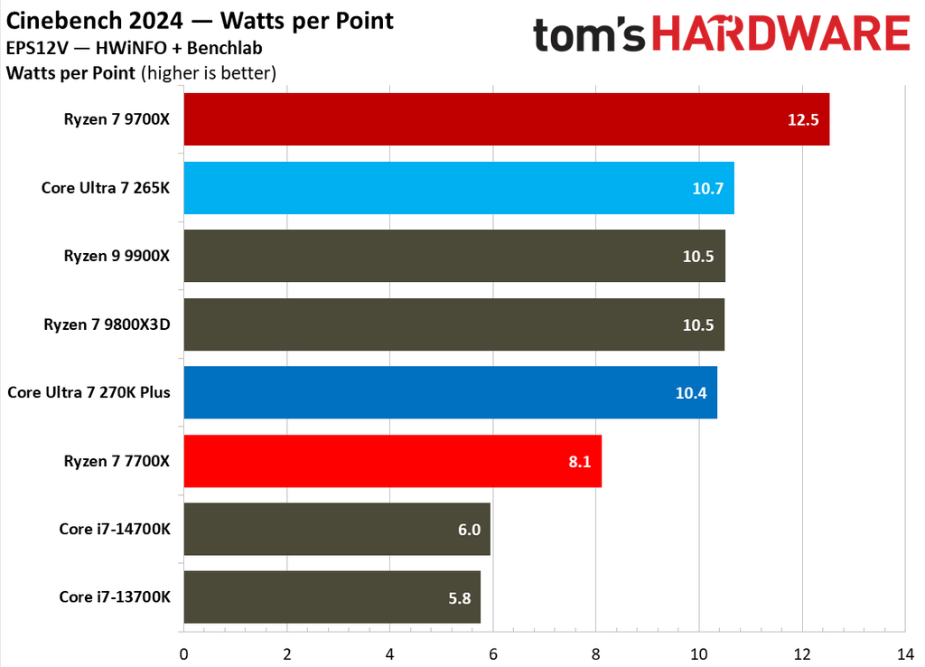 The AMD Ryzen 7 9700X consumes less than half the power on average than the Core Ultra 7 270K Plus, and is also more efficient in several tests, making it the clear winner in this round.