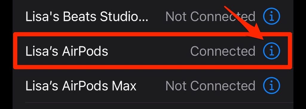 3. Find your AirPods in the list of Bluetooth devices and tap the i symbol next to it.