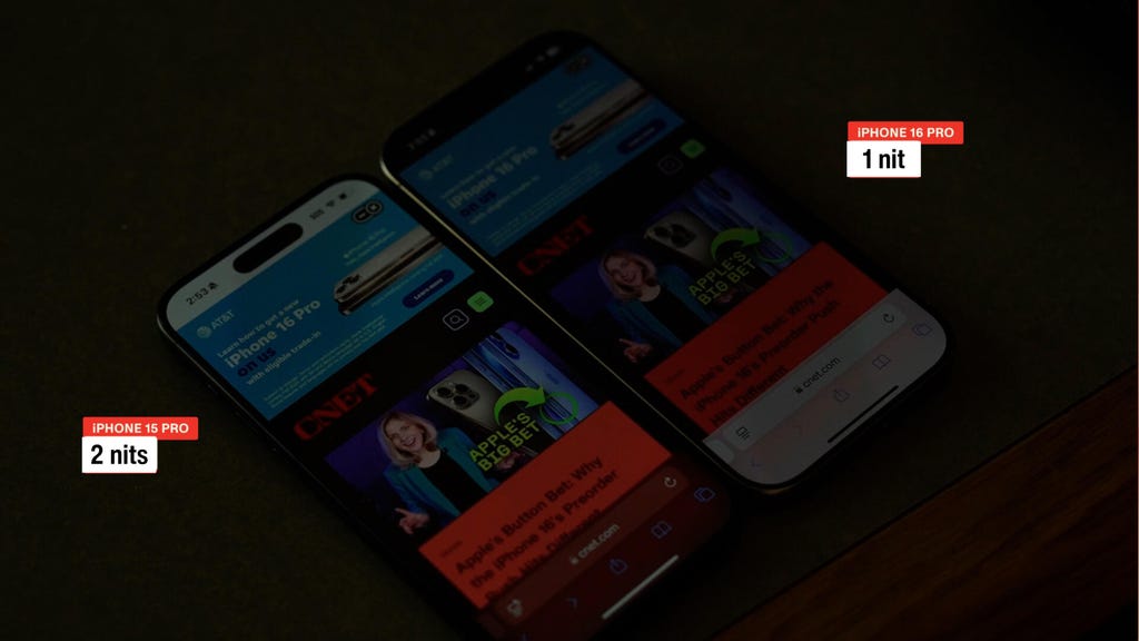 Here is the iPhone 15 Pro (left) next to the iPhone 16 Pro in a dark room. Both phone have their screen brightness turned as far down as they go. Marc Ganley/CNET