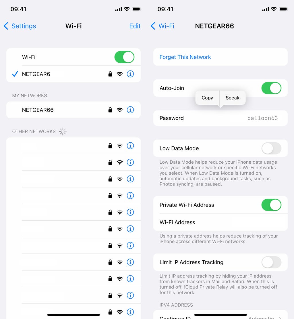 You can view passwords for any Wi-Fi networks you've ever connected to, as long as you're currently connected to it or near enough that it appears under My Networks. Screenshots by Nelson Aguilar/CNET
