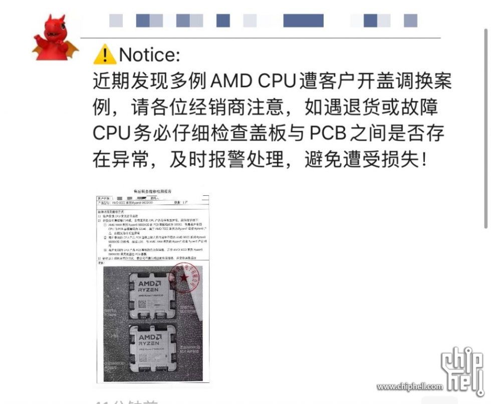 A machine translation of the MSI China notice reads: "Recently, there have been many cases of AMD CPUs being opened and replaced by customers. Dealers, please pay attention. In case of returns or malfunctions, the CPU must carefully check whether there are any abnormalities between the cover and the PCB, and report to the police in time to avoid losses!"