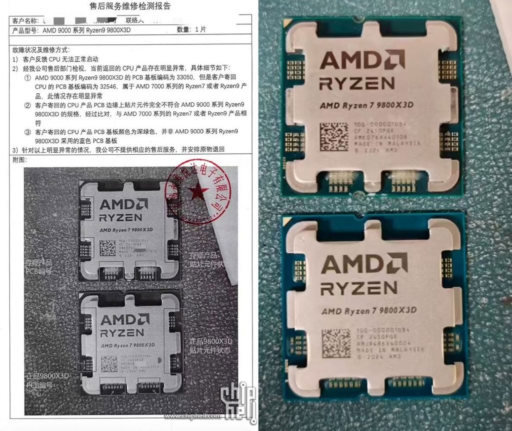 This discussion of counterfeit CPUs centers on a purported AMD after-sales service inspection report for a fake Ryzen 7 9800X3D, also from ChipHell. Despite the counterfeiters' efforts, there are some noticeable differences between the fake and genuine chips, at least in this instance.